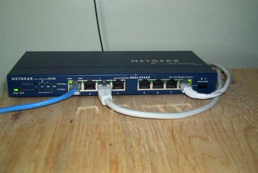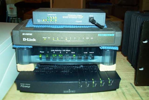 The Netgear 8 Port Hub 10/100 feeds to downstairs network.